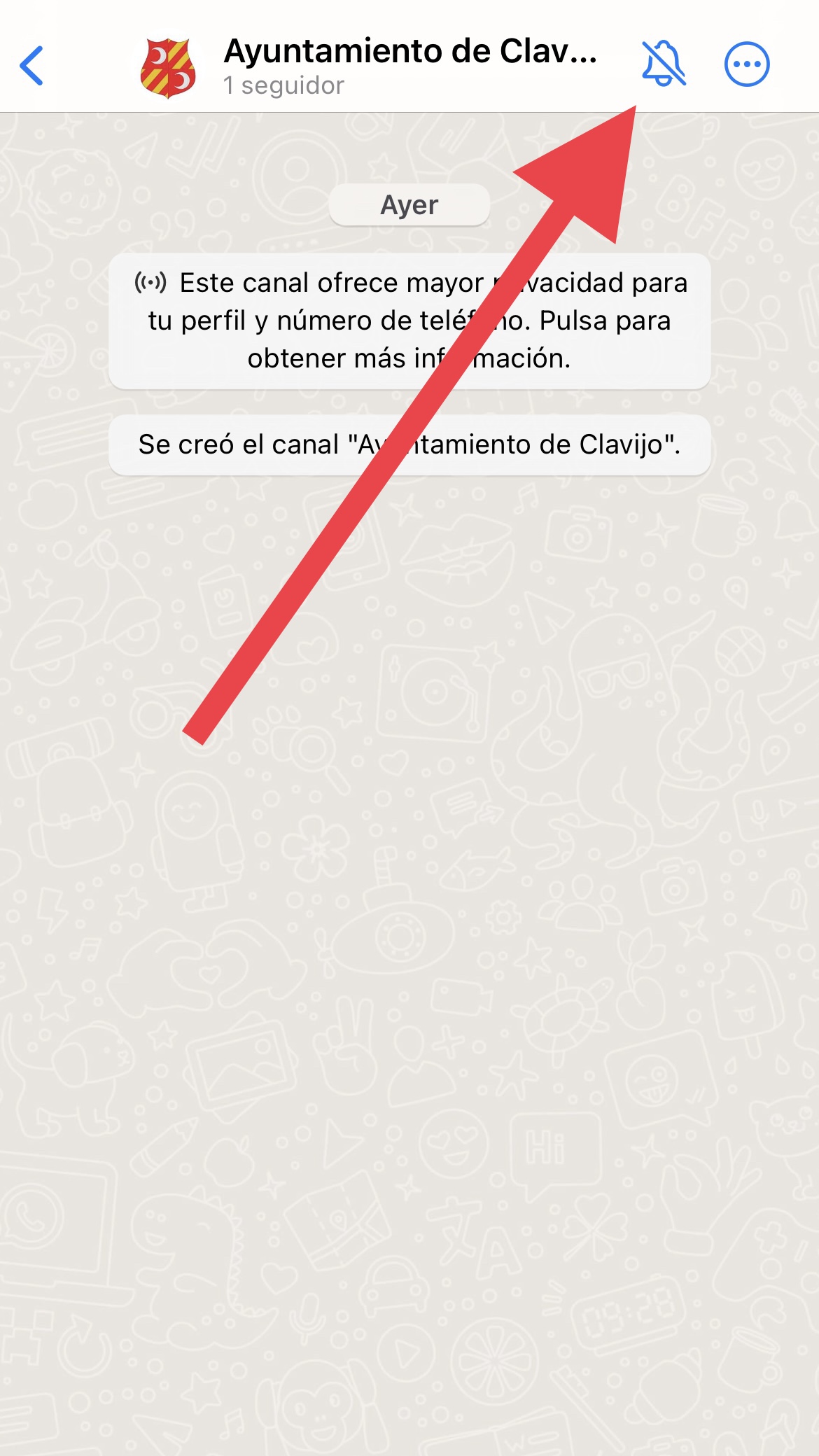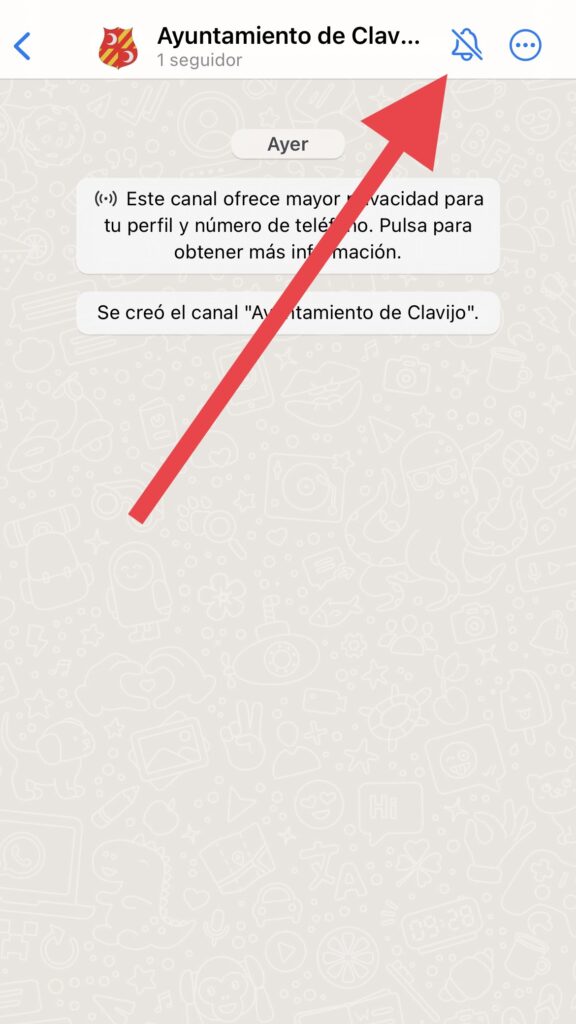 Con la última versión de la aplicación instalada en su móvil, pinche en este enlace que le llevará a su WhatsApp. Se le abrirá una página de chat con un mensaje de bienvenida o bien con la última publicación del canal. En la parte superior de la pantalla de su móvil deberá aparecer una leyenda de ‘Seguir’. Pinche sobre ella para estar al tanto de todo lo que ocurre en el municipio. Una vez dentro del canal se le mostrará una campana para activar o desactivar las notificaciones. Si las activa, la aplicación le avisará cada vez que enviemos un mensaje.