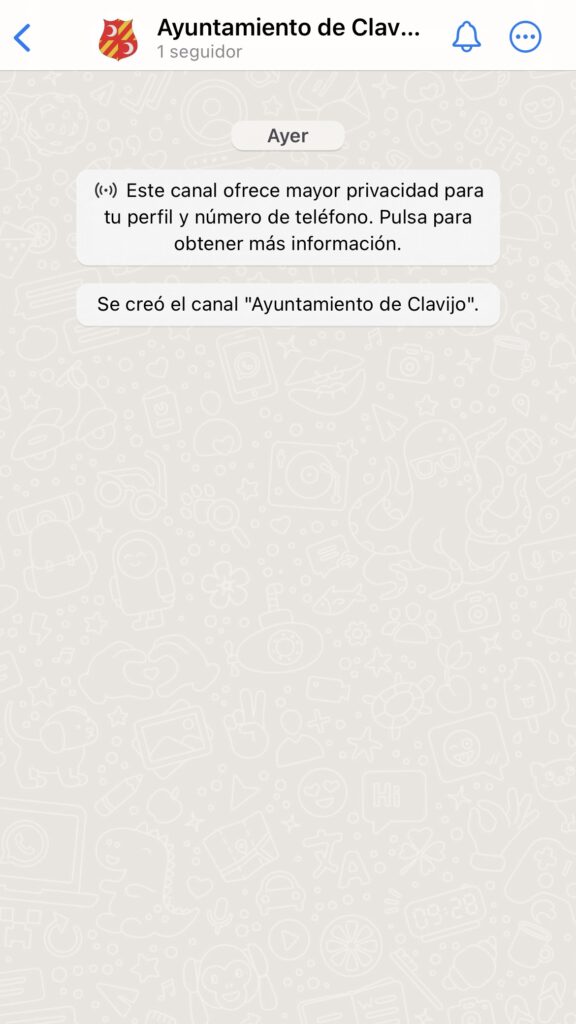 El Ayuntamiento de Clavijo refuerza su servicio informativo con la ciudadanía por medio de la creación de un canal de WhatsApp, una nueva función de la aplicación de mensajería instantánea con la que los usuarios recibirán antes que nadie comunicaciones de interés sobre nuestra localidad: noticias, avisos, bandos y agenda cultural entre otras informaciones. Cualquier persona interesada en recibir las novedades informativas en su teléfono móvil a través de WhatsApp puede inscribirse de forma completamente gratuita pinchando aquí desde el móvil.